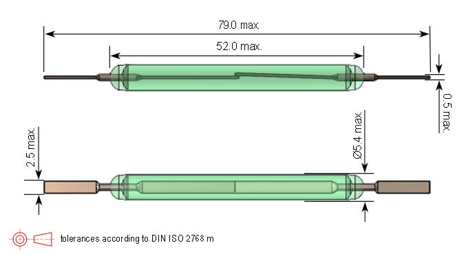 高頻干簧開關 玻璃體長度 53.4mm 直徑 5.4mm 額定功率 25 W 切換電壓 500 VDC 切換電流1.5 Amp DC。
